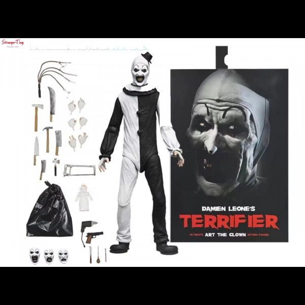 The enigmatic Art the Clown is here to stalk your shelves. The iconic villain from Damien Leone's Terrifier is getting NECA's Ultimate treatment. Capturing every eerie detail of the silent slasher, this 7-inch scale articulated action figure includes interchangeable expressions and hands. Plus, an unsettling arsenal of weapons and accessories! Comes in collector-friendly window box packaging with opening front flap-perfect for your horror display.