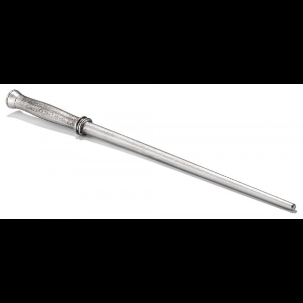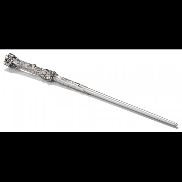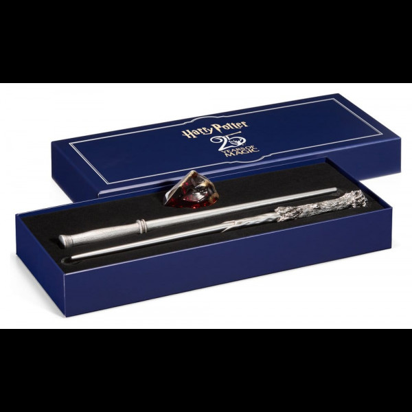 Entrambe le bacchette sono realizzate in resina di alta qualità e presentano un'incantevole finitura argento antico. Confezionato in una scatola da collezione blu, completa di decorazioni in lamina oro e argento per il 25° anniversario, il set include anche una replica fedele all'originale della Pietra Filosofale.