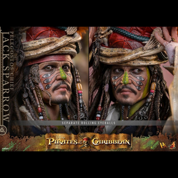 Sideshow and Hot Toys proudly presents the Pelegostos Chief Jack Sparrow Sixth Scale Collectible Figure based on the unforgettable moment from Pirates of the Caribbean: Dead Man's Chest when Captain Jack Sparrow finds himself crowned as the reluctant ruler of the Pelegostos tribe. The sixth scale action figure features a finely crafted head sculpt with Pelegostos tribe face paintings, detailed hair sculpt that includes his signature red bandana, hair accessories, and a strap of wool hair implantation to enhance its realism. His highly articulated body also displays tribal paint markings. The figure includes a variety of interchangeable hands to recreate Jack's expressive gestures, along with a finely tailored costume that reflects his time with the tribe.