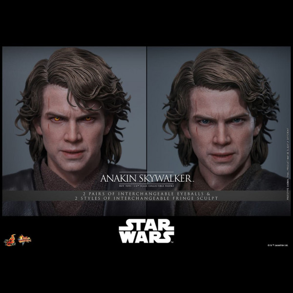 Sideshow e Hot Toys sono onorati di presentare la statuetta da collezione Anakin Skywalker™ in scala 1/6, uno straordinario tributo all'interpretazione del personaggio da parte di Hayden Christensen. Realizzata con la massima cura dei dettagli, l'action figure di Star Wars presenta una scultura della testa di nuova concezione con due paia di bulbi oculari rotanti intercambiabili e due stili di frange intercambiabili per riflettere l'espressione di Anakin, segnata dalla battaglia, in continua evoluzione. Per la prima volta, i collezionisti possono alternare realistici bulbi oculari con iride blu e bulbi oculari con iride gialla Sith per evidenziare il suo drammatico passaggio al lato oscuro.