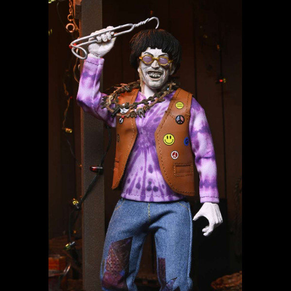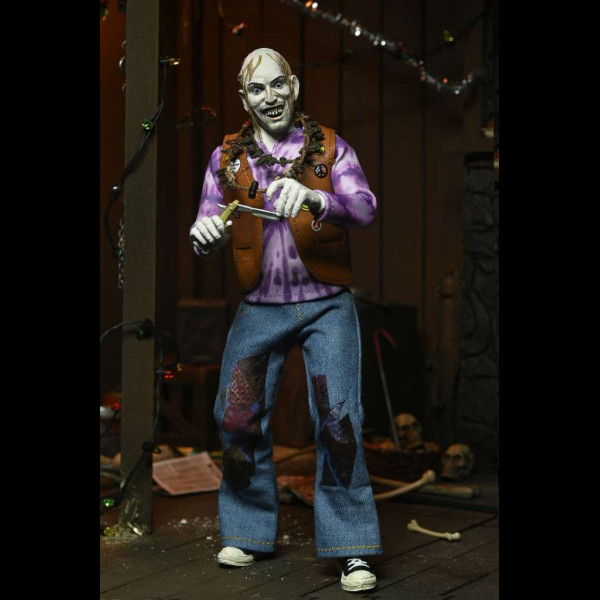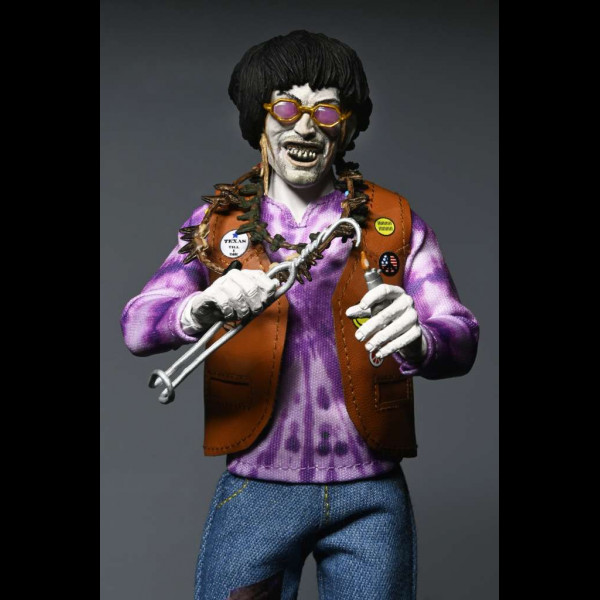 From the 1986 film, Leatherface's sadistic brother Chop Top stands 20 cm tall and is dressed in intricately detailed and tailored fabric clothing similar to the iconic toy lines of the 1970s.