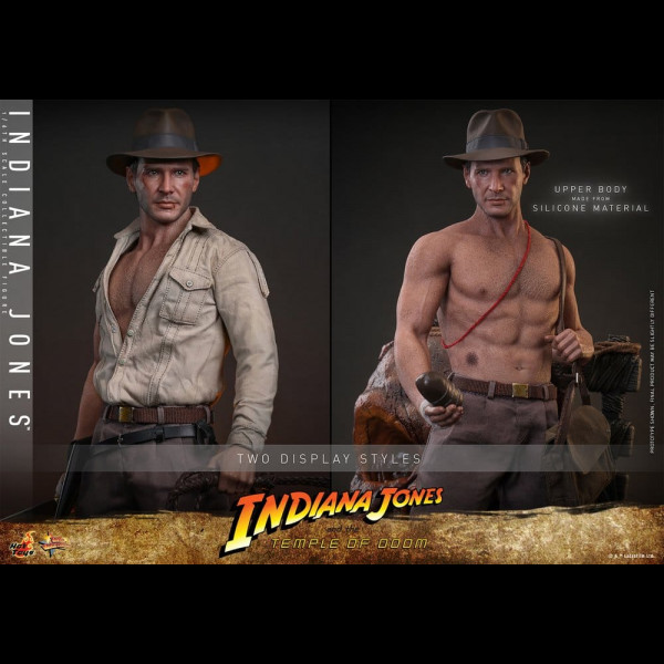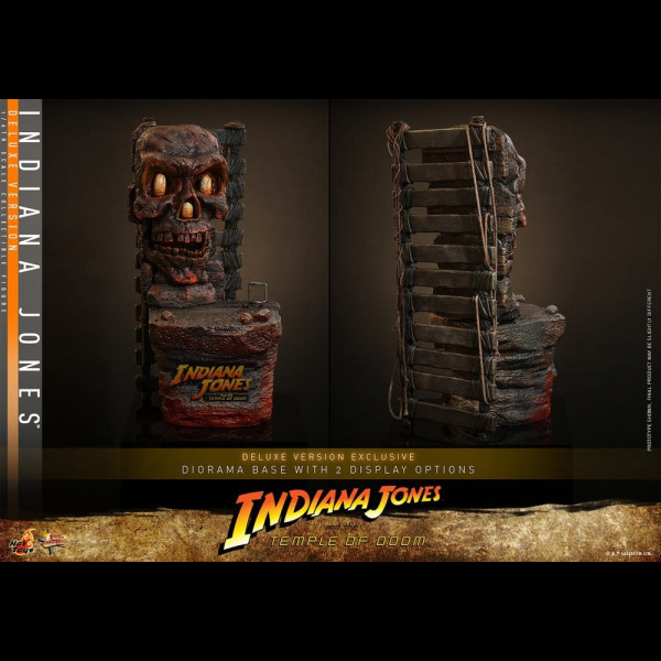 The costume is finely tailored to replicate his on-screen appearance, featuring one-sleeved shirt and trousers with weathering and distressed effects for a battle-damaged look. It includes a fabric belt, a genuine leather belt with a holster, and a pair of boots. Additionally, it comes with a red cord for his shirtless look. The figure is equipped with an array of weapons and accessories, including a genuine leather whip, a spear, a machete, a revolver, a crossbody bag, a Sanskrit manuscript, and two sets of Sankara Stones (in both dormant and activated states). The Deluxe Version features a newly designed skull altar-themed diorama base that can hold the Sankara Stones, along with roped planks at the back, allowing for various dynamic displays.