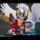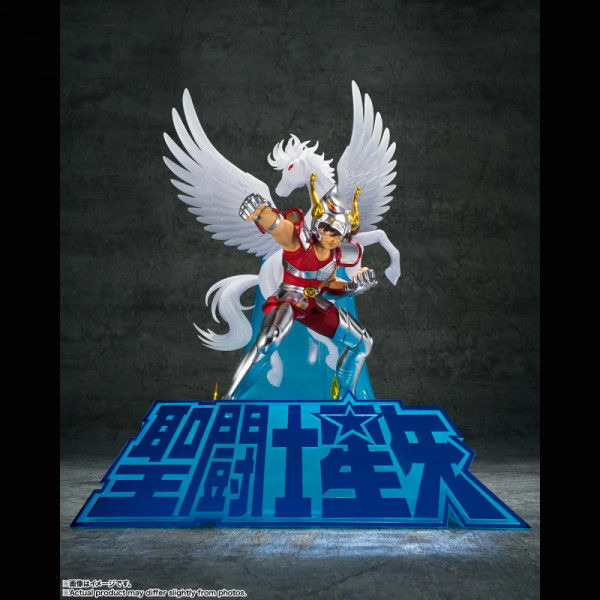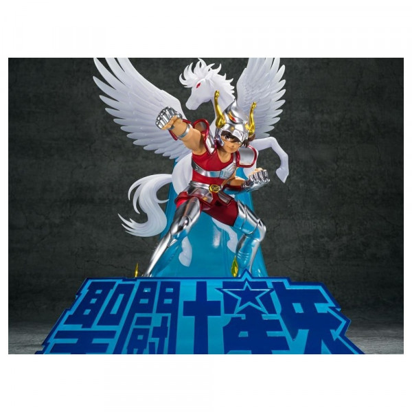 La base espositiva richiama la celebre rappresentazione del logo di Saint Seiya vista nell’opening, mentre alle spalle di Seiya è raffigurato il simbolo del Pegaso, per un forte impatto scenico.